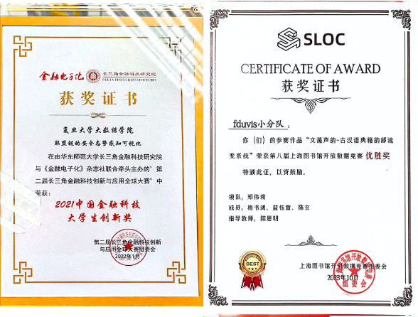 郑伟莉是古籍所的一名博士生,她对数字人文产生了浓厚的兴趣,她主动找到陈思明老师想要学习数据可视化技术,最后和FDUVIS的陈玄、梅书鸿和蓝钰萱等同学们共同组成了人文+技术+艺术的跨学科团队,共同探索数据可视化技术如何帮助传统的“冷门绝学”音韵学更直观地被看见、以及更深入地被探索。郑伟莉带领合作小分队努力钻研,终于构建出了“文藻声韵”古汉语典籍韵部流变系统,参与了上海图书馆开放数据竞赛获得了优胜奖,虽然不是第一名,但这对于文学博士生郑伟莉同学而言,也是一个很大的进步与突破,更加坚定了她对数字人文学术探索的决心。