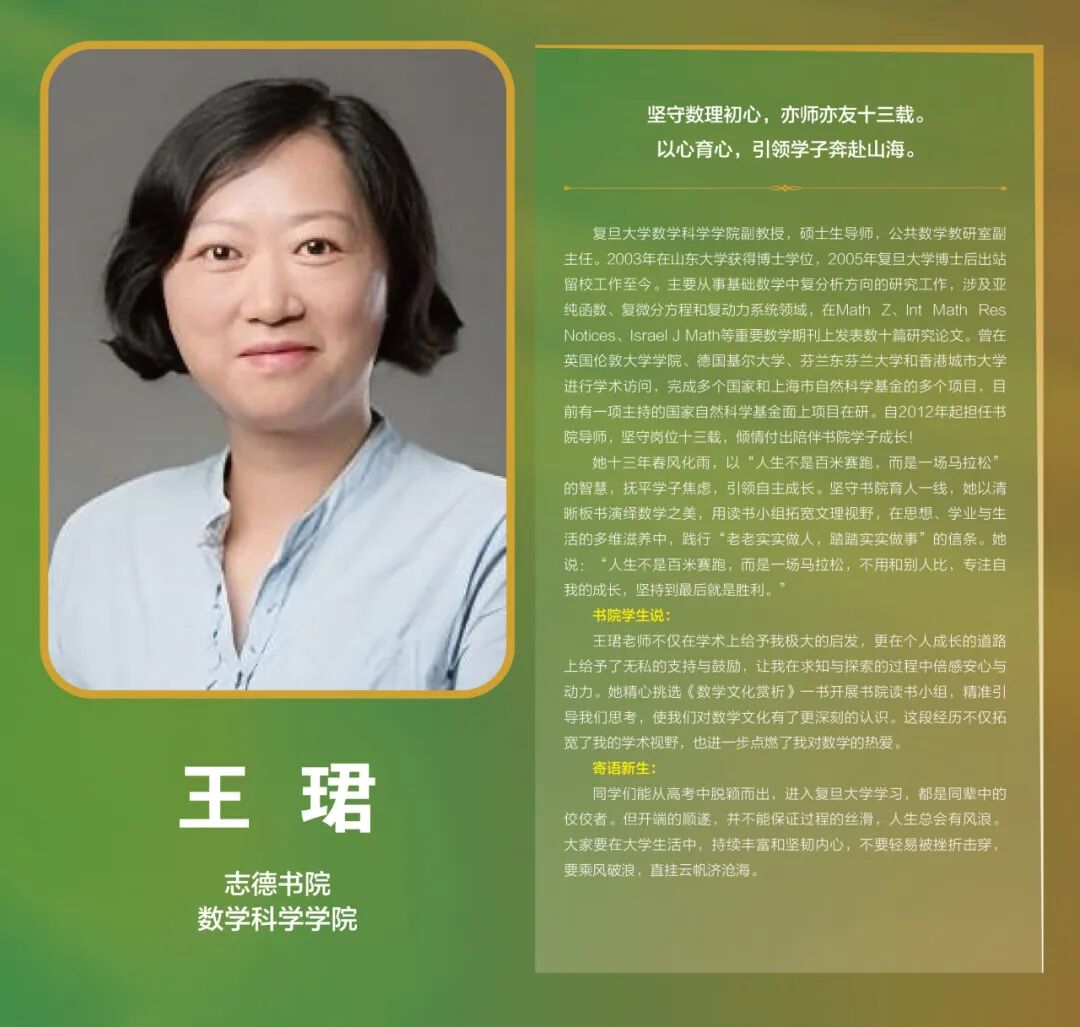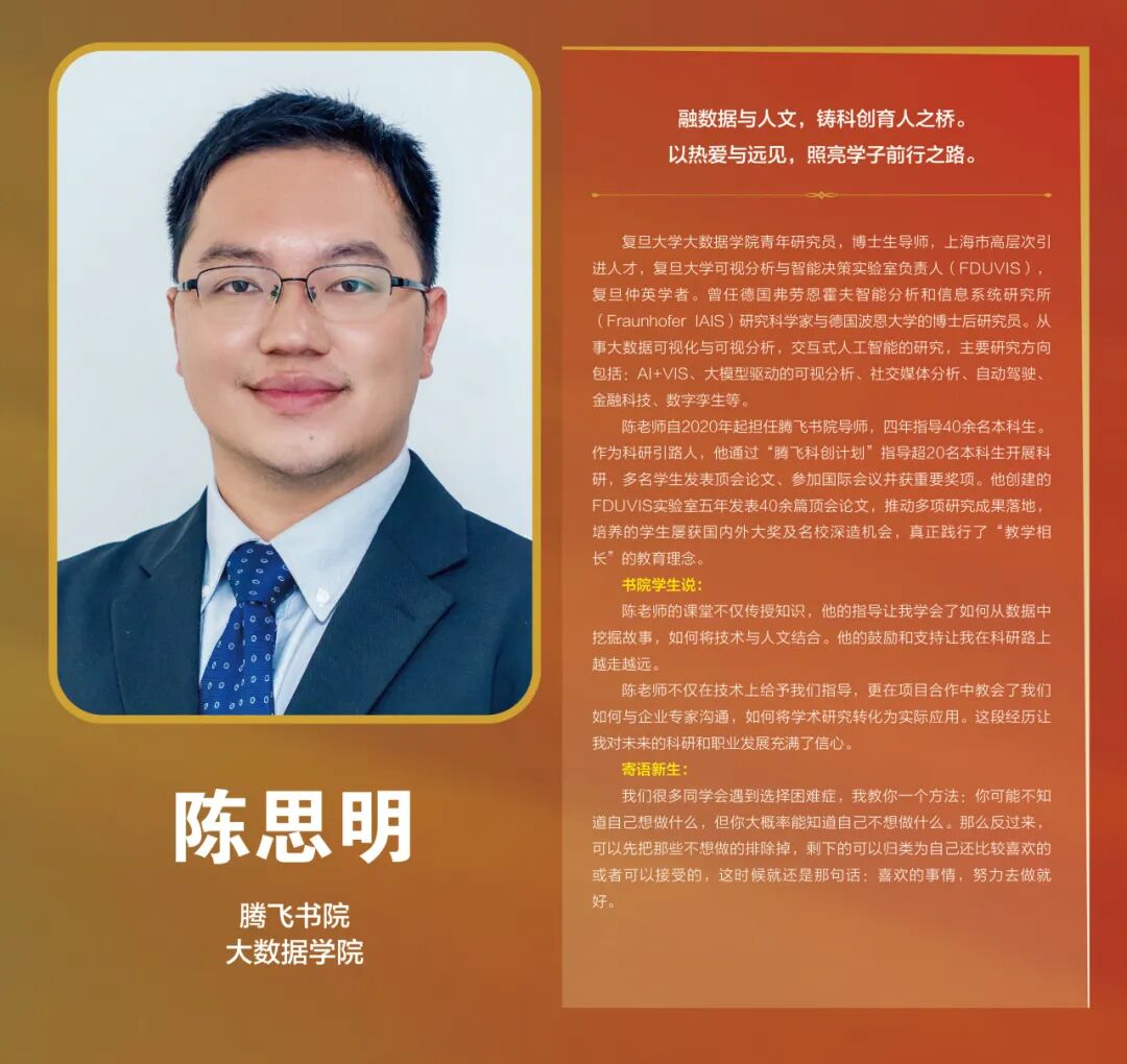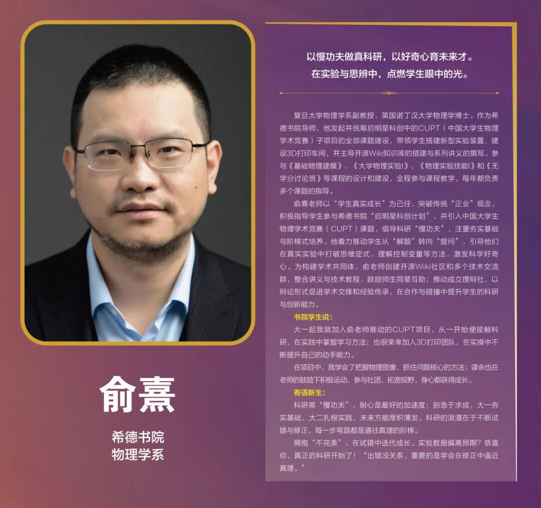 此前,我们已陆续推出每位获奖导师的独家专访,从跨学科育人的创新实践,到科研路上的悉心指引;从书院生活的温暖陪伴,到创新创业的鼎力支持,每一篇文字都记录着他们以爱为犁、以智为种的育人故事。今天,我们将这些闪光的片段集结成册,一同重温这份坚守与热爱,感受复旦书院导师们独特的育人温度。